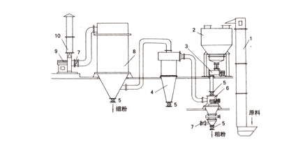 物料由加料口加入上筒體旁的回轉(zhuǎn)閥門輸送入分級室。在水平安裝的轉(zhuǎn)子旁分散、分級。粗粉甩至筒壁處向下移動在風(fēng)柵處受二次空氣作用及中心管的一次空氣吹送。細粉再次脫離粗粉被送至轉(zhuǎn)子處進行分級,最終粗粉向下移動,由下筒體上的回轉(zhuǎn)閥排出機外,細粉穿過轉(zhuǎn)子葉片的間隙由排氣管送出機外,在捕集器中尾氣由風(fēng)機放至大氣。