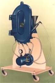 壓力氣體通過加料噴射器產(chǎn)生的射流,使粉碎原料被吸入混合室,并經(jīng)文丘里管射入“O”形環(huán)道下端的粉碎腔,在粉碎腔外圍粉碎噴嘴高速射流的作用下,相互間發(fā)生猛烈的碰撞、摩擦實(shí)現(xiàn)粉碎。